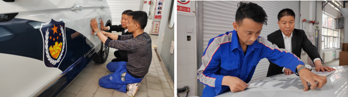 圖5為:售后漆工冶龍正在為警車貼警徽標志,他說:“警車是公務用車,每次粘警飾我都感到很神圣,干活兒特別用心細致,一定要把車身警飾做得非常好才行。警徽閃耀,守望千家萬戶。我是漆工也是工匠,必須精益求精,把活兒干漂亮,這也是汽貿(mào)漆工的臉面。每次我都把車清洗干凈,用卷尺量好間距,用記號筆畫好。在貼的過程中用刮板反復擠壓空氣,這樣才能使警徽粘得更牢固更美觀。我要把公司倡導的勞動精神、工匠精神,通過不斷地學習鍛煉,提高本領(lǐng),把精湛的工匠手藝和貼心的服務傳遞給社會。